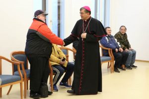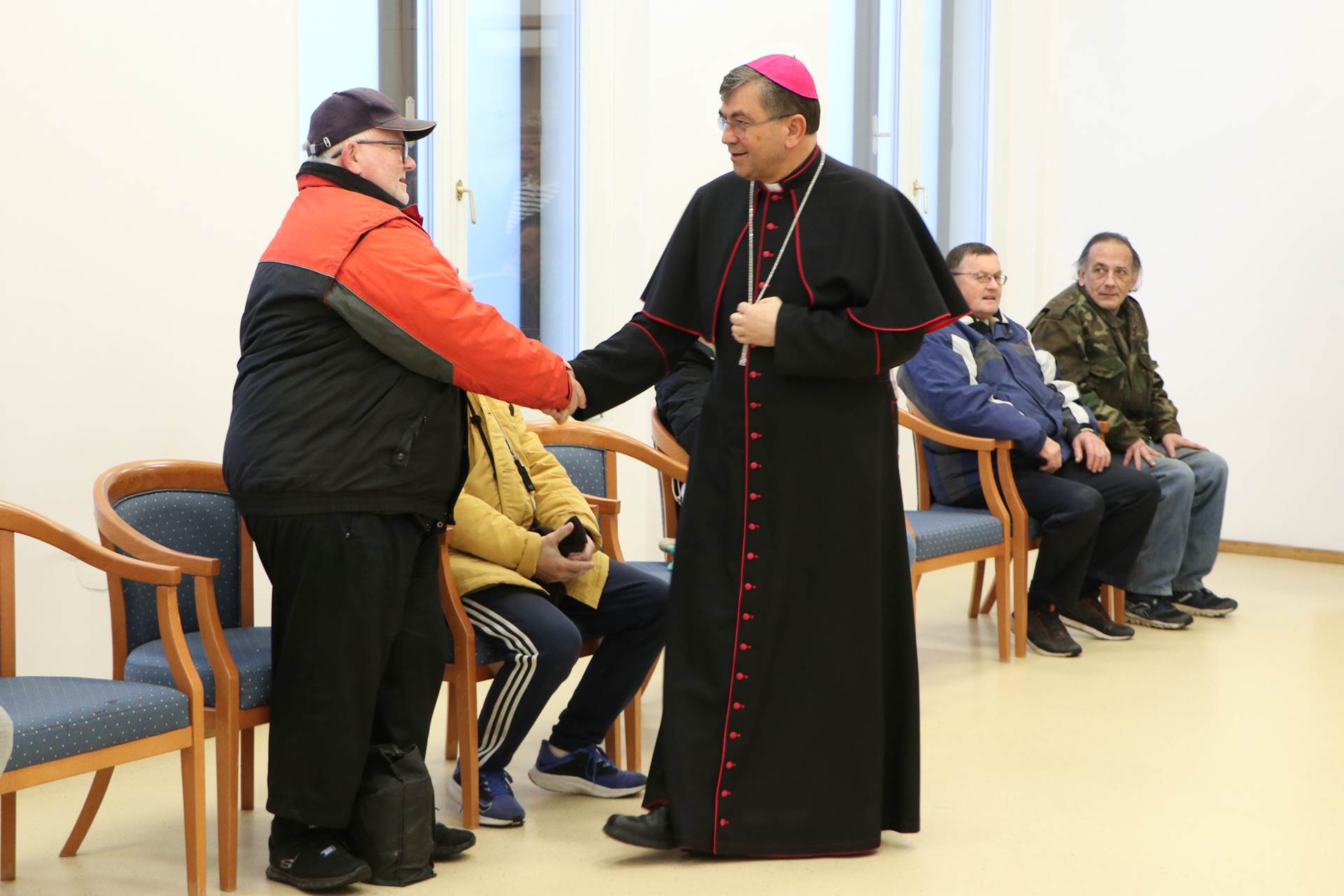 Uz srdačne izraze dobrodošlice u ime volontera i djelatnika koje je izrekla ravnateljica, biskup se, zahvalivši na pozdravnim riječima dobrodošlice, obratio nazočnim korisnicima različitih programa pomoći te je u razgovoru s njima iskazao zanimanje za njihove obiteljske situacije i uputio im ohrabrujuću riječ. Osvrnuvši se i na sinoćnji humanitarni koncert „Božić u nama“ biskup im je poručio da uz Caritas i dobre ljude nisu sami. Spomenuo je kako im i svojim dolaskom želi potvrditi da su oni imaju svoje dostojanstva kojem služi Biskupija po svom Caritasu. Kazao je kako je karitativna djelatnost zastupljena na materijalnom području na različite načine pružanjem pomoći obiteljima