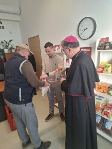 Na početku biskup Ivo se susreo s korisnicima Caritasove akcije „Kruh naš svagdašnji“. U razgovoru s nazočnim korisnicima biskup je iskazao zanimanje za njihove obiteljske situacije i uputio im ohrabrujuću riječ i uručio prigodne pakete.