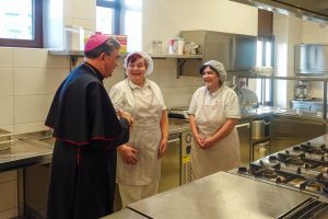 Zahvaljujući na pozdravnim riječima dobrodošlice, biskup je zahvalio vodstvu Caritasa na čelu s ravnateljicom, tajnikom i volonterima za požrtvovnost kojom pomažu ljudima u potrebi, te je njima i njihovim obiteljima zaželio sretan Božić. Svratio je potom u Caritasovu kuhinju koja svakodnevno pripravlja tople obroke za 70-ak osoba i organizirano ih razvozi u domove onih koji si ih sami ne mogu osigurati. Biskup je zahvalio djelatnicima kuhinje za vjerno služenje siromašnima i nemoćnima te je njima i obiteljima čestitao Božić.